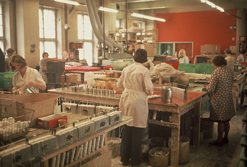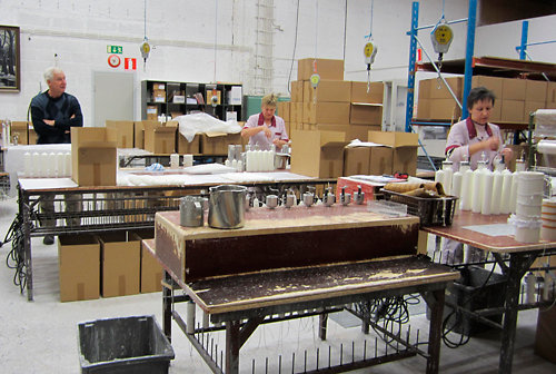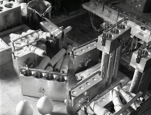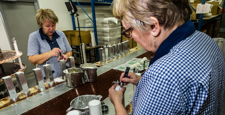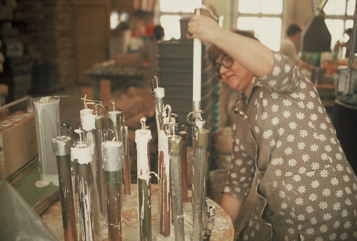 Kynttilän valmistusta Juhavan tehtaalla